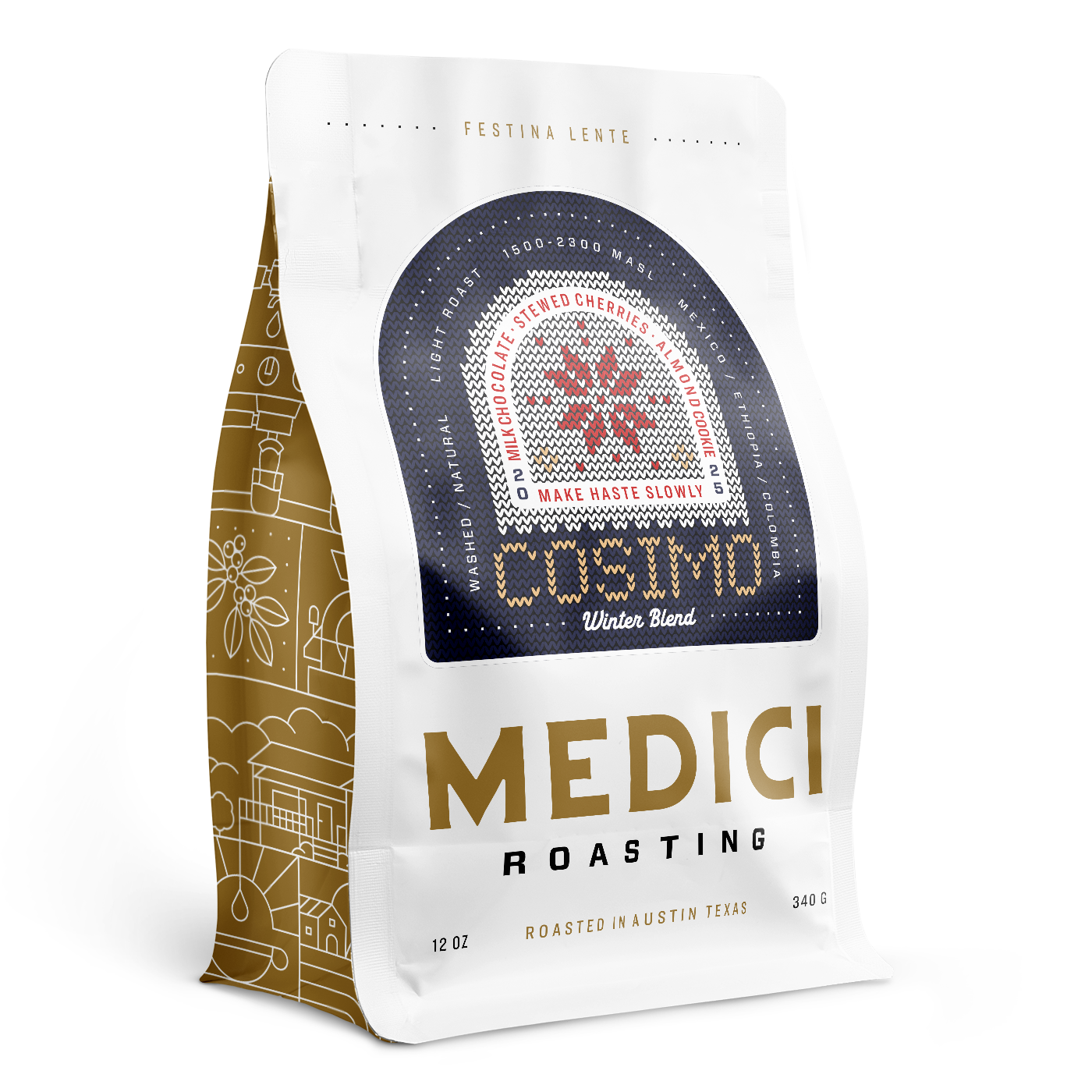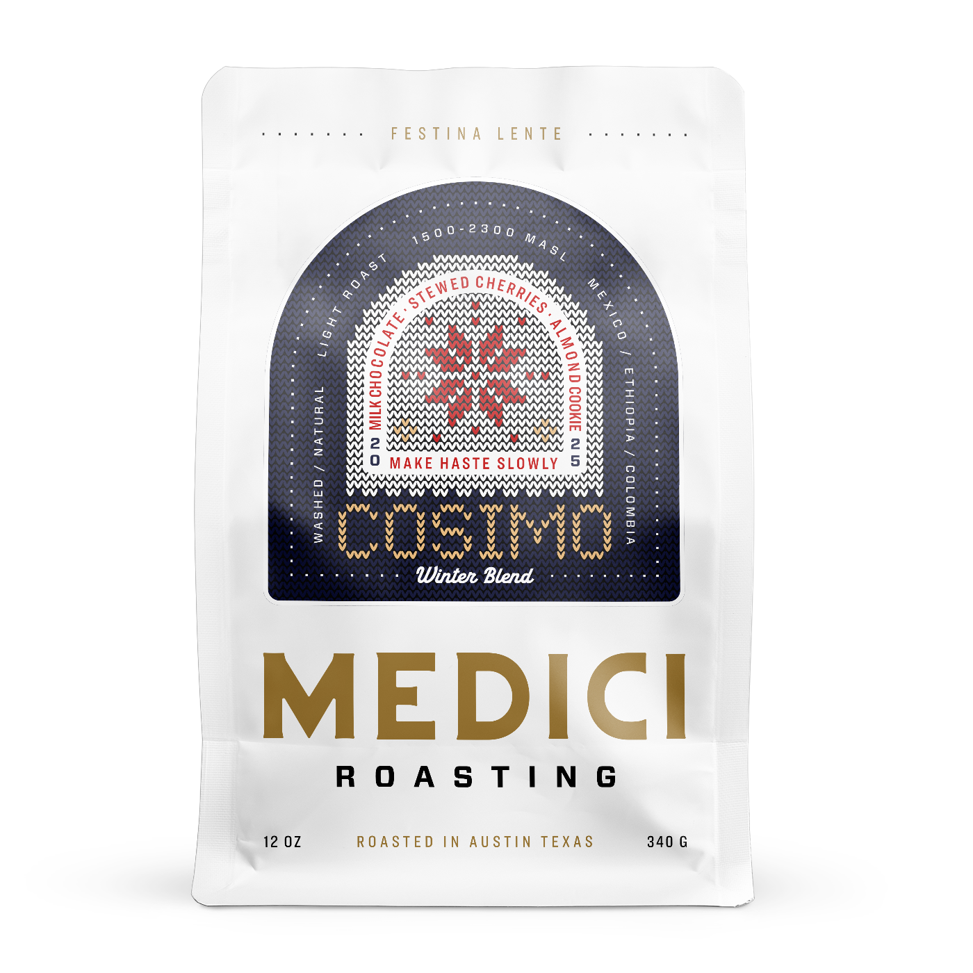 Cosimo's Winter Blend is a balanced and well rounded roast with notes of milk chocolate, stewed cherries and almond cookies. Perfect for sipping on with family and friends!
